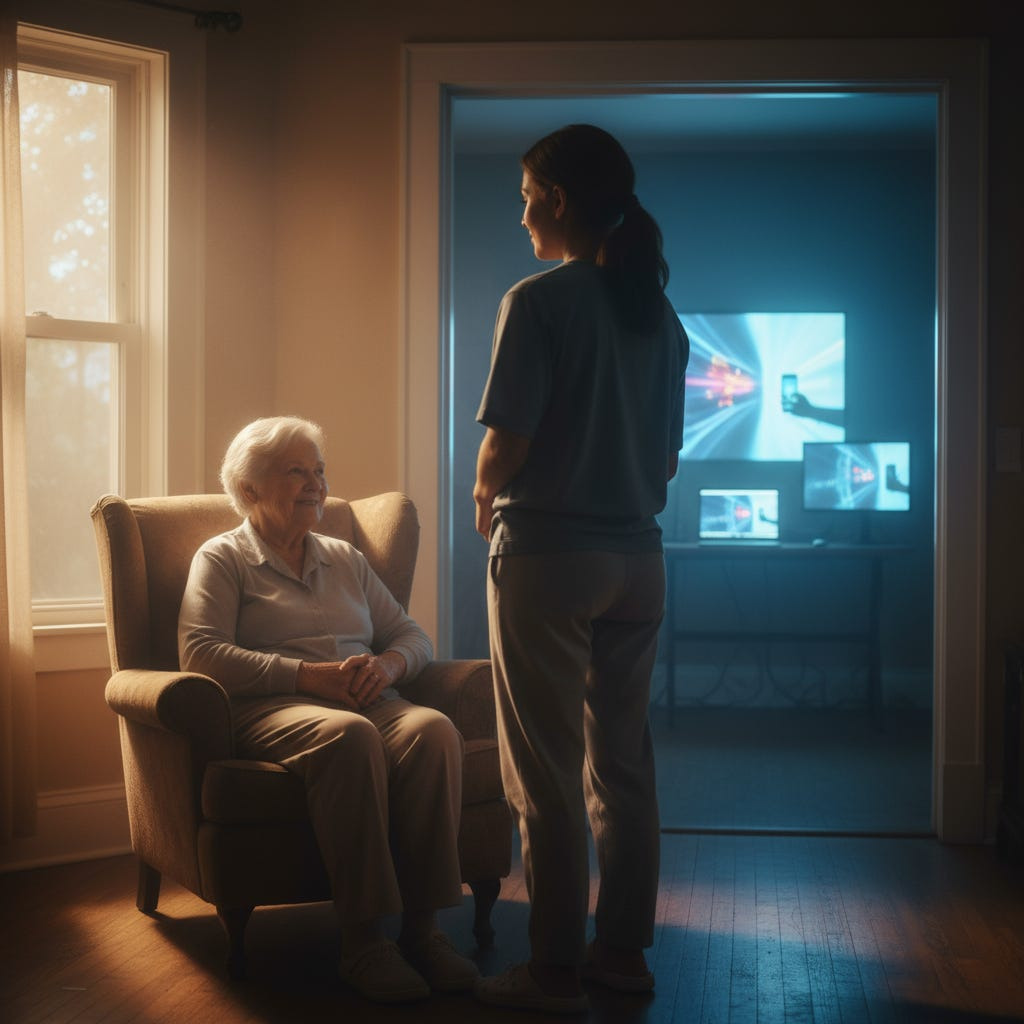 But caregiving exists almost entirely outside that market. It’s unmeasured, unoptimized, largely invisible. There is no engagement rate for holding a trembling hand. No algorithm rewards you for patience. Every act of care is an act of sustained attention, and that makes it heresy in a world that worships speed.