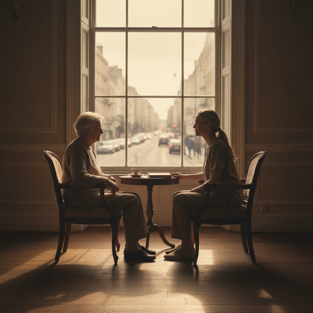 I think of the young caregivers I’ve worked with, pre-med and nursing students who tell me that sitting with an elder is “the first time I’ve been truly present in years.” A generation raised in the glow of screens, learning to make eye contact again. Learning that not all meaning can be streamed. Learning that some things can only be received through the discipline of attention.